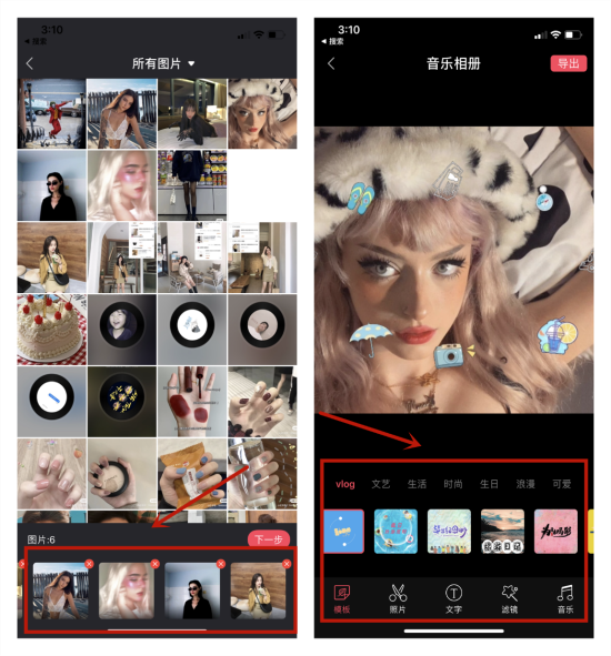 直接进入手机相册页面,上传多张照片,选择喜欢的模板。
