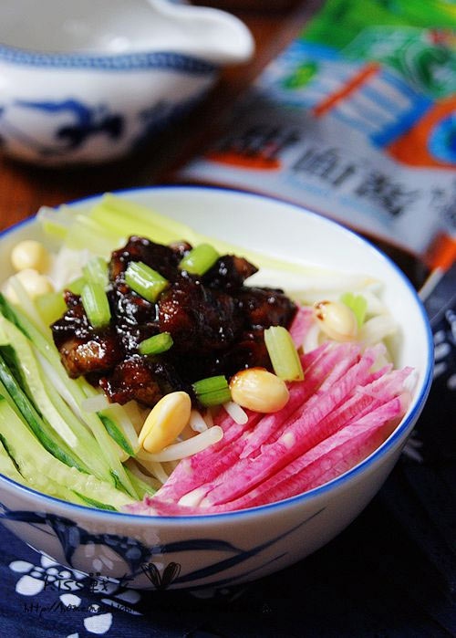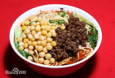 炸酱面:是中国汉族特色面食,被誉为“中国十大面条”之一,流行于北京 、天津、河北,辽宁、吉林等北方地区。将黄瓜、香椿、豆芽、青豆、黄豆切好或煮好,做成菜码备用。将肉丁及葱姜等放在油里炒,再加入黄豆制作的黄酱或甜面酱炸炒而成炸酱。面条煮熟后,捞出,浇上炸酱,拌以菜码,即成炸酱面。