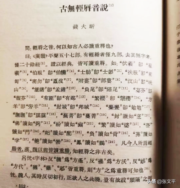 钱大昕在《古无轻唇音说》一文中说,他读古书时,看到古人有时把“阿房宫”写成“阿旁宫”,把“汾水”写成“盆水”,把“匍匐”,写成“扶服”“蒲伏”,把“伏羲(又作伏牺)”,写成“包牺” “庖羲”等等,就用心琢磨开了:为什么这些声母为轻唇音“f[佛]”的文字,在先秦两汉古籍中往往写成声母为重唇音的别字呢?而声母为重唇音“b[玻]”“p[坡]”“m[摸]”的文字,在先秦两汉典籍中却往往写成声母为轻唇音“f[佛]”的别字?