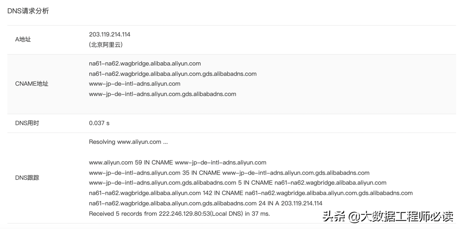 经过定时的拨测任务,阿里云拨测可以生成不同地区的 DNS 解析用时的报表,同时针对每次拨测都清晰的列出 DNS 请求对详情,包括 A 地址、DNS 用时、DNS 解析过程等,能给帮助用户快速分析和定位 DNS 解析的问题。