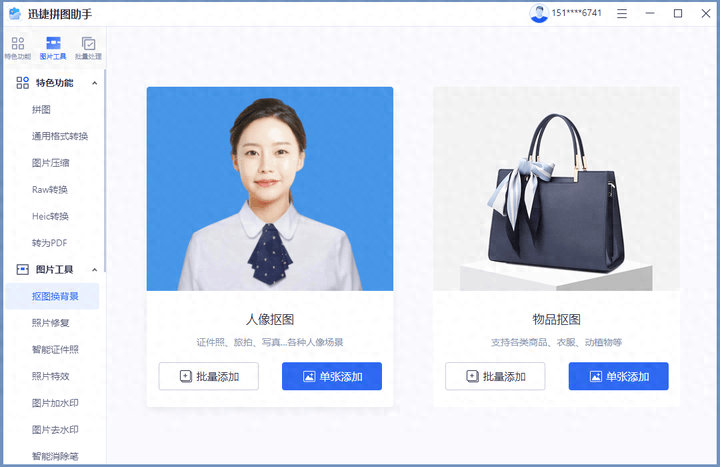 这是一款主打拼图功能的多功能电脑修图软件,支持多个功能,包括抠图、图片压缩、图片转换、修复、证件照制作等,操作上比较简单。