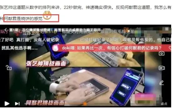但是没想到刚刚得到第一,何猷君就被人扒出疑似成绩造假。在华容道的环节上,何猷君的速度太快了,超过第二名足足四秒的时间,但按照“华容道”的真实速度和步骤,这种秒数太过快了,不止是脑速快,并且手速也开挂了,有网友当时就质疑了何猷君有可能提前预知题目。