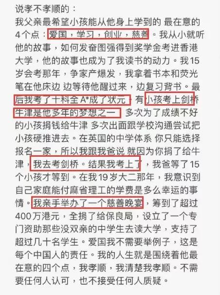 可以看出何猷君的这份声明几乎就是冲着赌王的希望写的,赌王希望自己的孩子成为学霸,别人都做不到,但何猷君做到了;赌王希望自己孩子爱国慈善,何猷君便在小小年举办慈善晚宴,在外人看来何猷君完全按照父亲的意愿去做事情,诚心孝心皆有。