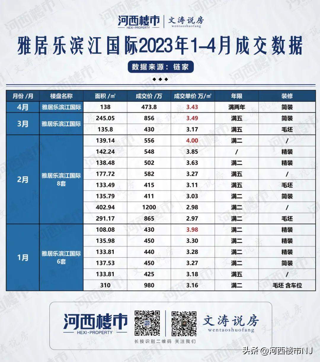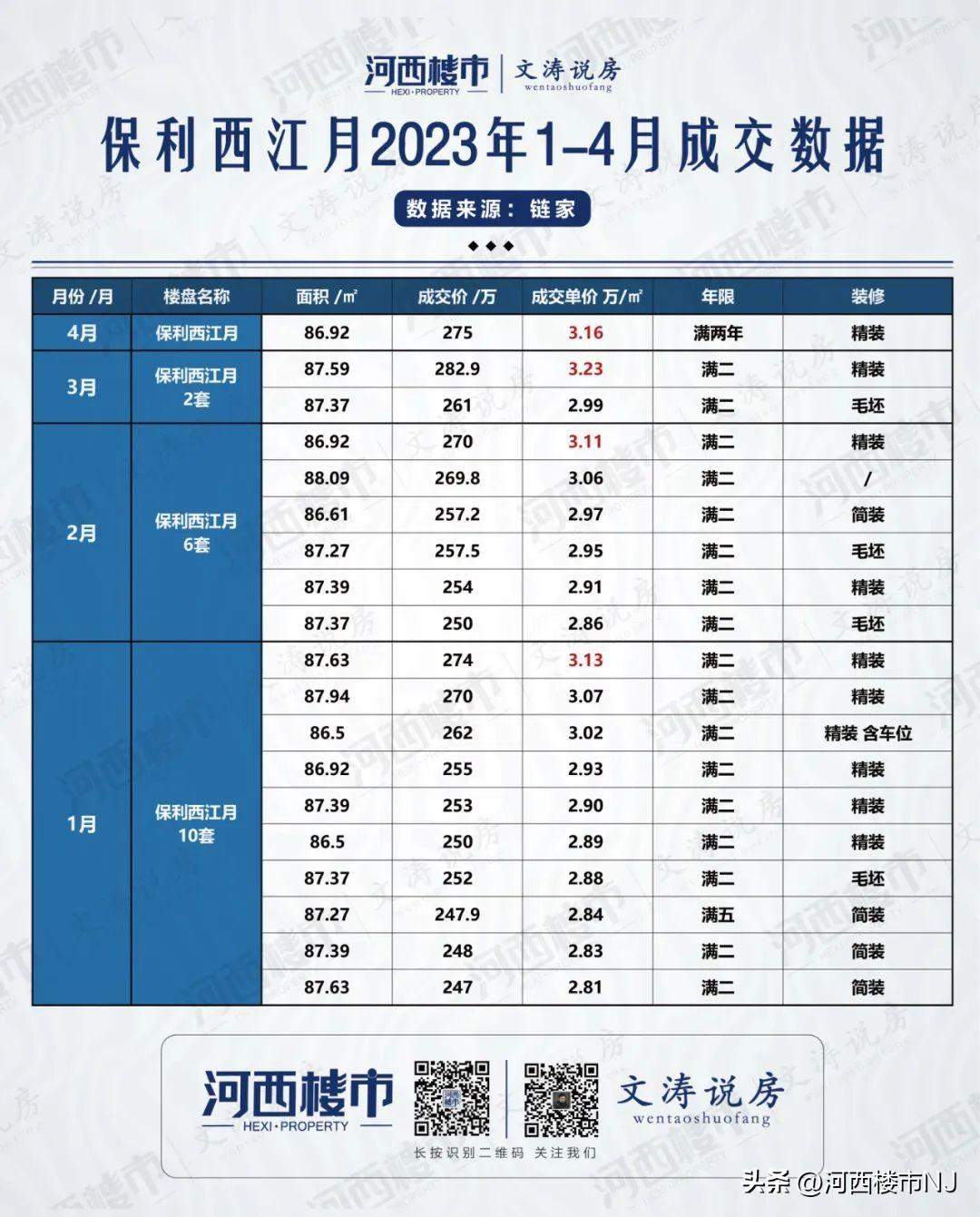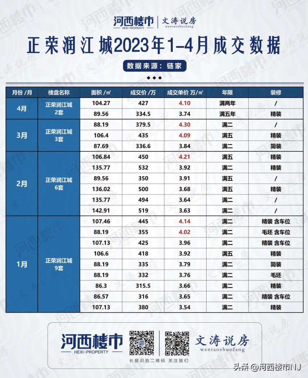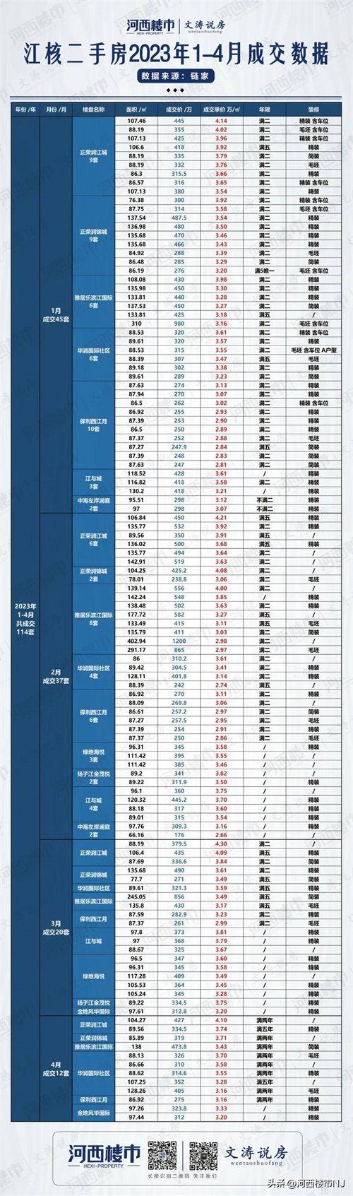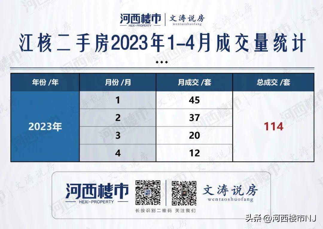 据不完全统计:2023年江核1-4月总成交量为114套,其中