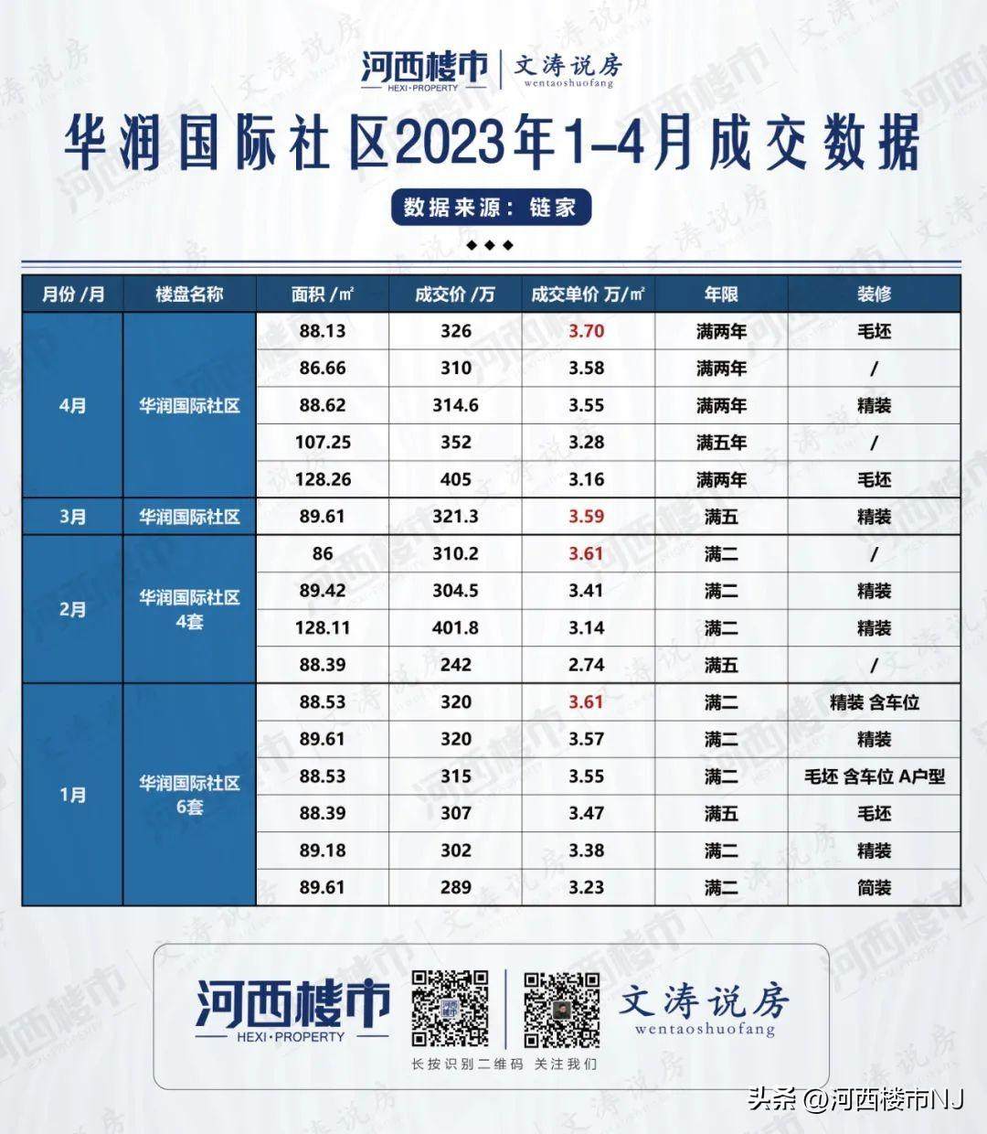 2023年1-4月,华润国际社区共成交了16套房源,其中88㎡左右小三房卖的最多,共成交了13套。