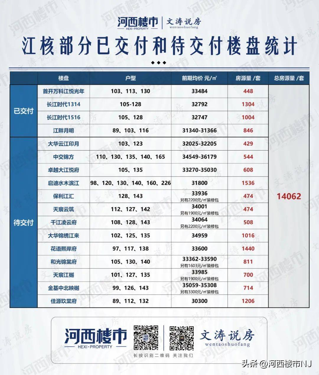据统计,江核部分已交付和待交付次新房(17家)和在售待上市新房(20家),总房源量约22853套!(不包含待上市地块房源)