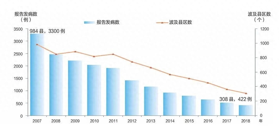 中国新闻-两会专刊中的2007 年后中国狂犬病发病 – 波及县区变化趋势图