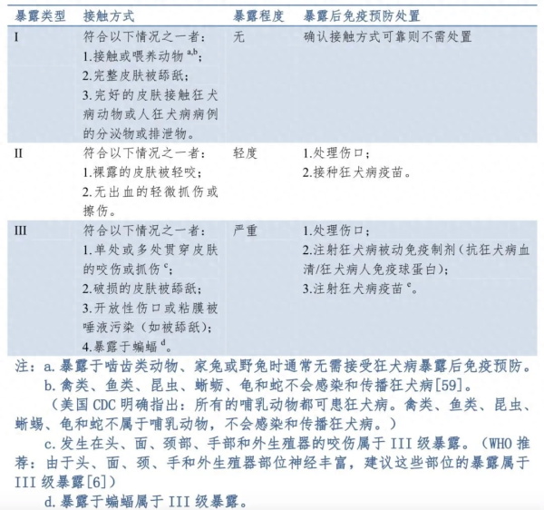 其中Ⅱ级暴露和Ⅲ级暴露都被要求立即处理伤口,并接种狂犬病疫苗(其中Ⅲ级暴露还需根据具体情况接种抗狂犬病血清或者狂犬病人免疫球蛋白)。