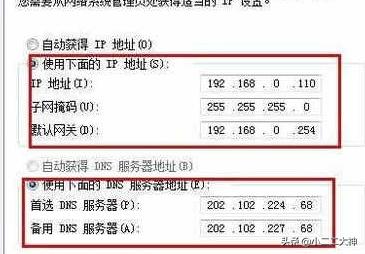 4.出来一个ip地址更改列表,上面选项是自动获取,一般通过无线路由器连接是不需要设置的。这里我们填上ip地址和dns即可;如果是公网地址则填写公网地址,如果是私网地址则填写私网ip(如192.168.1.2,或公司内网10.0.0.27)。