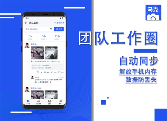 马克水印相机拍摄的高清照片将自动永久存储在云中,不占用手机内存,也将自动同步到团队,团队经理和个人工作者更好的团队合作,这些照片可以根据水印信息自动分类,用户也可以根据水印信息搜索,大大提高了效率。