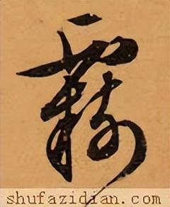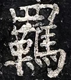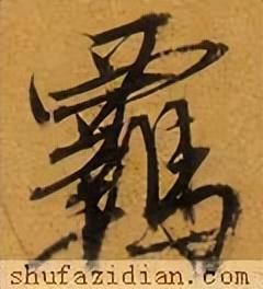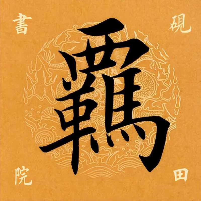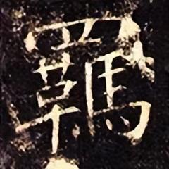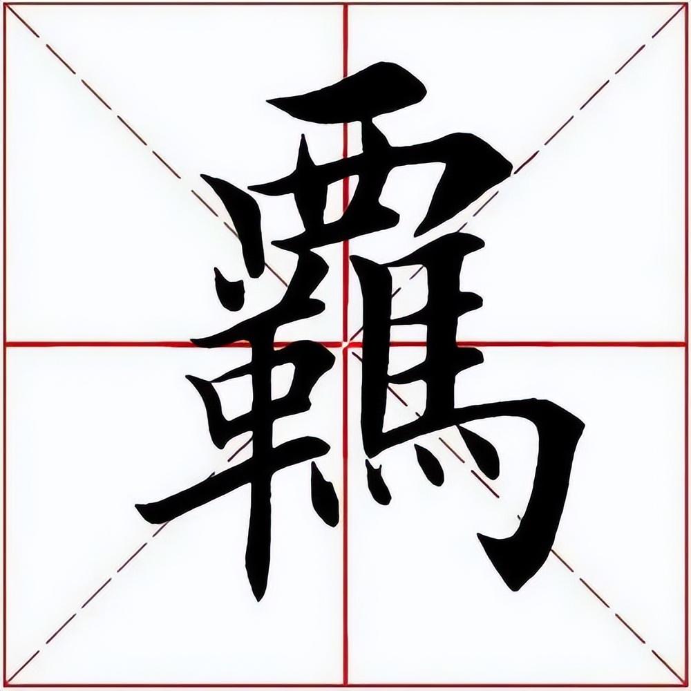 下部左收右展,整体抗肩。左边“革”字为书法写法,要靠左:点、撇上靠,左低右高,紧凑呼应;横画露锋起笔,大抗肩,勿重,与撇笔相接后即收。中间扁“口”稍偏左,上宽下窄,抗肩角度与上面协调,不要写重。下面长横起笔左探,大抗肩,略呈俯势,右边要收;竖笔实接起笔,稍左斜,渐重,垂露收笔。右边“马” 横画等距,上收下展:左竖斜切起笔,向下略左斜,渐轻,注意长度;三个横画虚接起笔,大抗肩,勿重、勿长,注意变化;中间竖笔实接起笔,略左斜,厚重有力;横折钩实接起笔,横画勿重,抗肩与上面横画协调,稍呈俯势,注意长度,到位后稍重顿笔、略内擫写竖,左斜,略弯,厚重,到位后跪笔弹锋起钩,钩勿大;最后四点要上靠,间距均匀,轻重得当,指向各异。