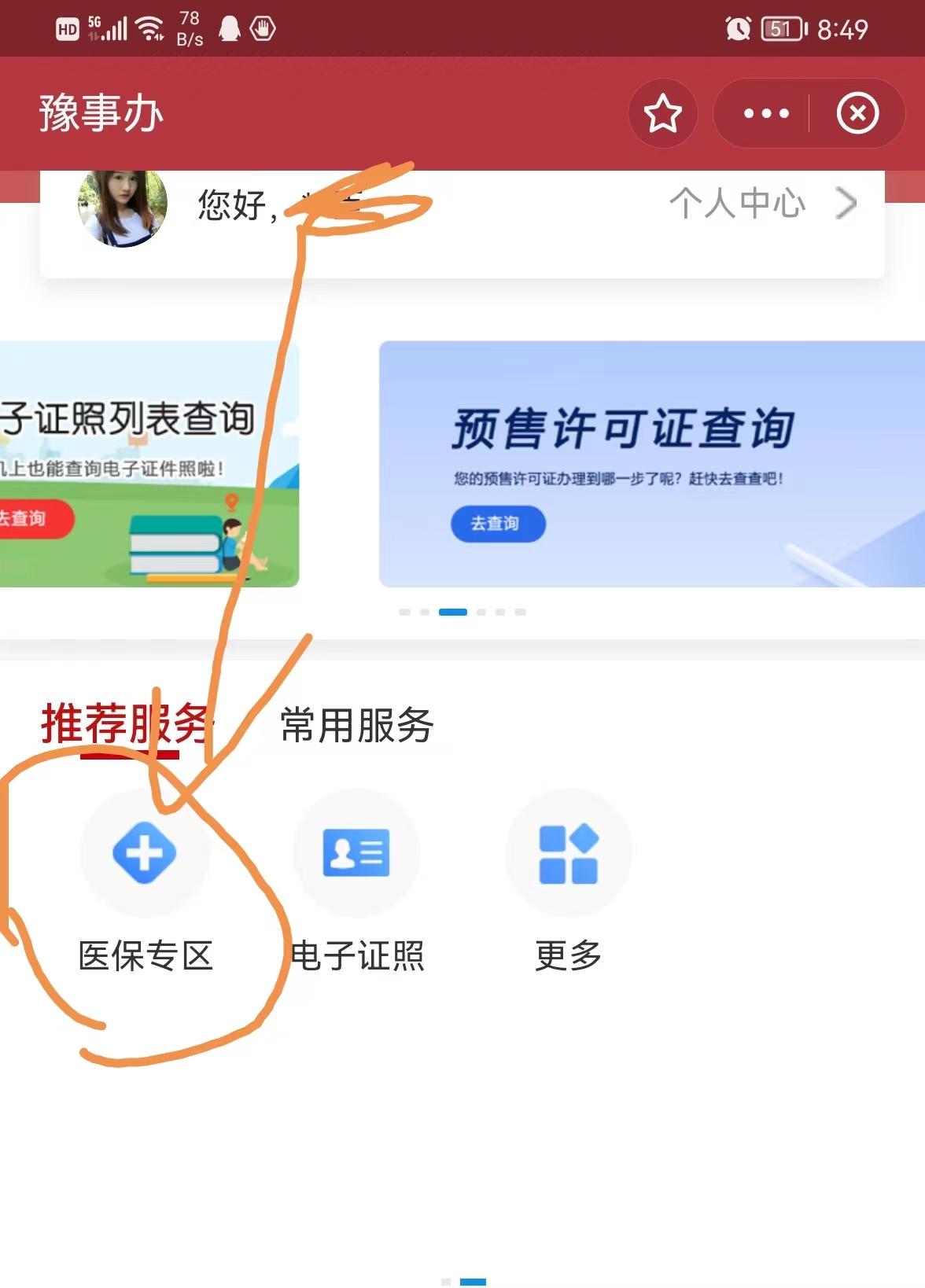 然后在推荐服务下面栏目列表处,向左划一下,就会出现“医保专区”。