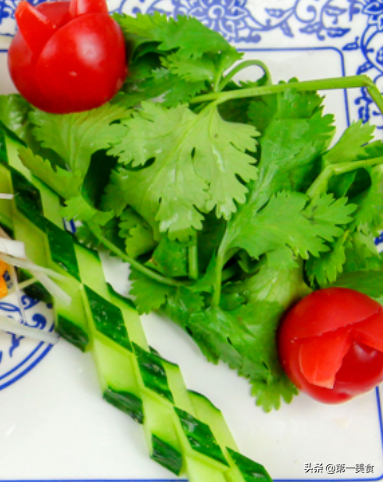准备一个盘子,放入一小把洗干净的香菜叶,切一点黄瓜和圣女果摆放在旁边当装饰品,抓入一小把葱姜丝和红椒丝垫在盘底备用。