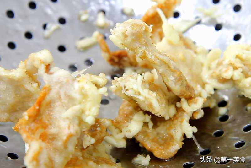 肉片下完以后开小火炸制,大约炸3分钟,肉片炸酥、炸脆以后倒出来控油。