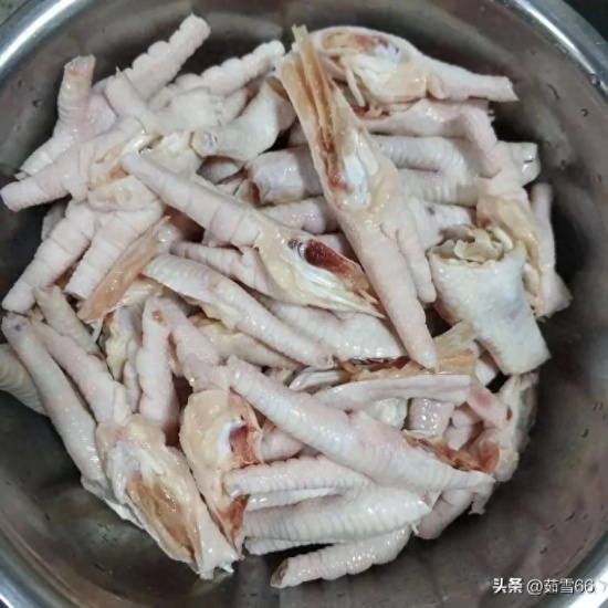 鸡爪清洗干净,剪去指甲,切成两半备用。