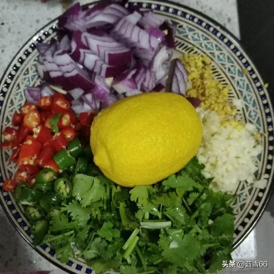 柠檬切成片,蒜姜切成末,洋葱切成小块,葱、香菜、青红辣椒切成段。