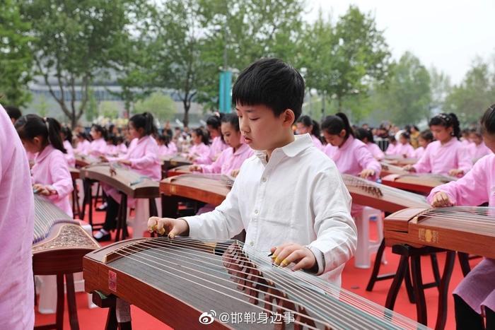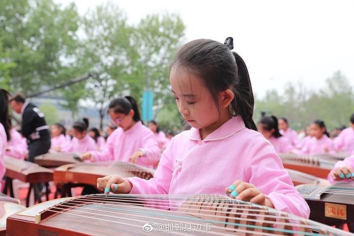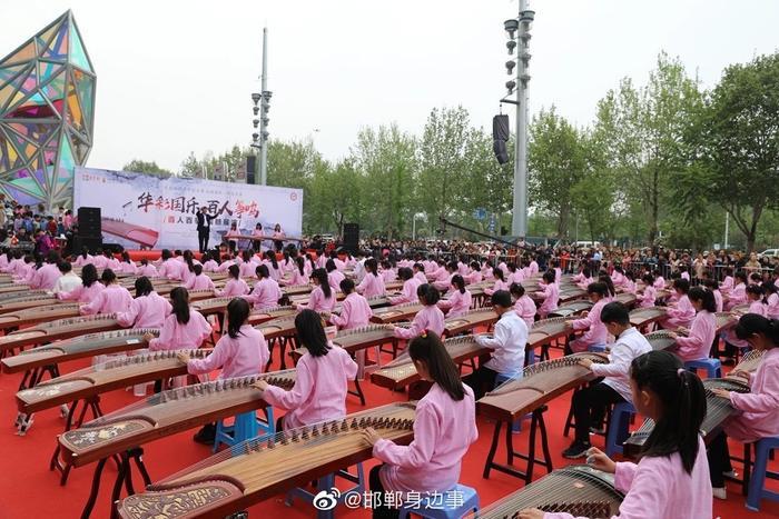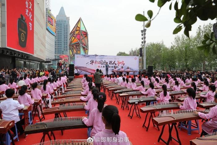 优雅的着装,悠扬的古筝,百人齐聚美乐城广场,拨弦弹奏,场面蔚为壮观,让人赏心悦目,引得众多摄影发烧友争相拍摄。150余人合奏《渔舟唱晚》、《笑傲江湖》等著名乐曲,弘扬中华民族优秀传统文化,推动文化与旅游融合发展,加深邯郸市3000年的历史文化的底蕴,提高城市魅力元素!