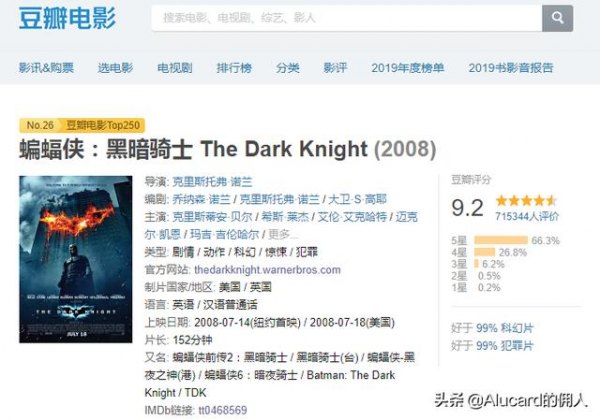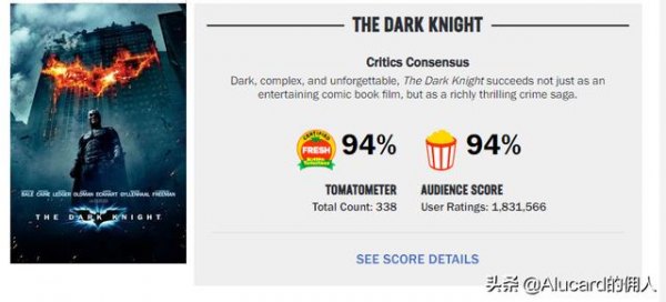 首先这部诺兰兄弟倾力打造的黑暗系超级英雄主题电影,在世界范围内评价都相当之高。评分方面,国内豆瓣为71万人次平均分9.2,IMDB 219万人次平均分9.0,烂番茄网站新鲜度为94%。