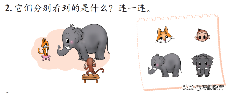 二是间接观察物体,如教材中“观察大象”——图中的小猴与小猫分别从两个不同的方向观察同一头大象,学生通过观察这幅图来辨别它们各自看到的大象是什么形状。这种间接观察物体的活动,学生经历的是“观察实物图—空间想象判断—形成表象—观察实物验证” 的过程。实物观察是“看图观察”的基础,“看图观察”是实物观察的发展,因此教材在问题串的设计上都是让学生经历从实物观察到“看图观察”的过程,以此帮助学生积累观察物体的经验,发展他们的空间观念。