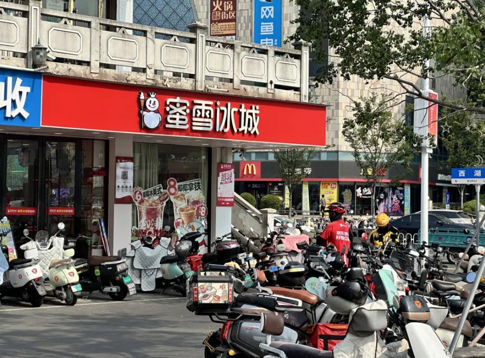 宿迁蜜雪冰城门店外取单的京东外卖、美团外卖小哥 图片来源:每经记者 王郁彪 摄