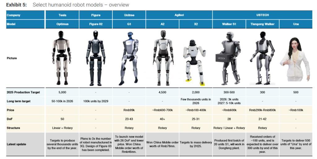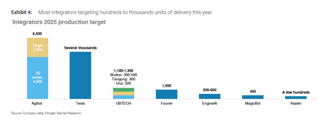 大多数集成商设定 2025 年交付数百至数千台的目标,尽管实际达成这些目标可能具有挑战性。爱智机器人计划交付 6,500 台,特斯拉数千台,优必选 1,100-1,300 台。这些订单的落地情况将成为衡量行业进展的关键指标。