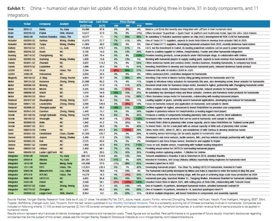 摩根士丹利已更新中国人形机器人产业链名单,包括 45 只股票,涵盖大脑(3 只)、身体组件(31 只)和集成商(11 只)。随着行业进入下半场比拼,谁能率先实现订单落地并验证商业价值将成为决定市场表现的关键因素,投资者应密切关注主要企业的商业进展和技术创新。