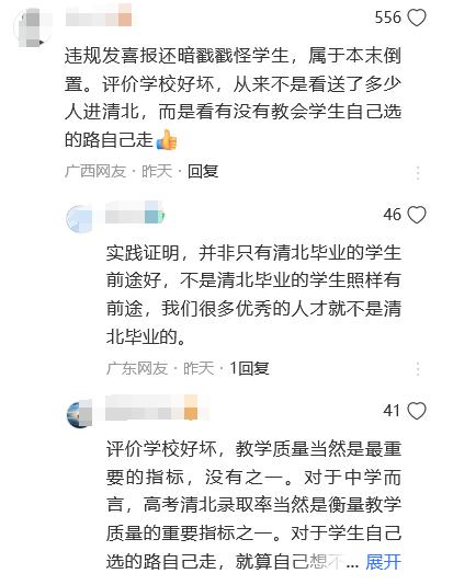喜报中 " 多名高分学生拒报清北志愿 " 的表述引发了网友的关注和讨论,有网友留言称,考生报考什么学校是自己的权利,从这则通报里,读出了指责的含义。也有网友称,政策明确规定,是不允许发高考喜报的。