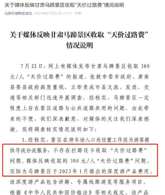 7 月 22 日,肃南县文旅局相关工作人员回应记者称,设卡收费属实,该行为不合适也不合法,今年已收到多起类似投诉。7 月 23 日,肃南县文旅局发布通报称,景区不存在拦路设卡收取 " 天价过路费 " 问题,收取的 300 元 / 人费用,实际为景区 2023 年 1 月推出的深度游产品费用。