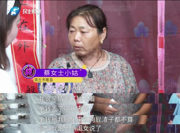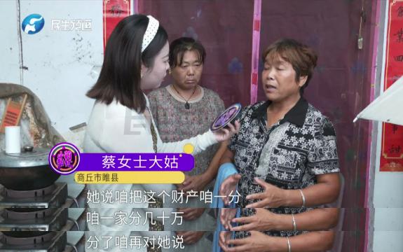 据蔡女士说,父亲躺在病床上的时候,自己的大姑和小姑让二姑告知自己这件事,可遭到了二姑的拒绝,原因竟是因为分财产。蔡女士大姑懊悔说到," 以前我贪财,家里缺钱,但实际上这个家产不应该分给俺,应该给他子女。" 小姑也在一旁后悔落泪," 这钱拿着心里不安,金钱丢了可以再挣,亲情丢了就找不到了。" 最后这个消息也是由小姑转告给了蔡女士。