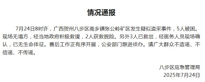 7 月 24 日 8 时许,广西贺州八步区南乡镇张公岭矿区发生疑似盗采事件,5 人被困。现场无塌方,经当地政府积极救援,2 人获救脱险。另外 3 人已救出,经医务人员现场确认,已无生命体征。