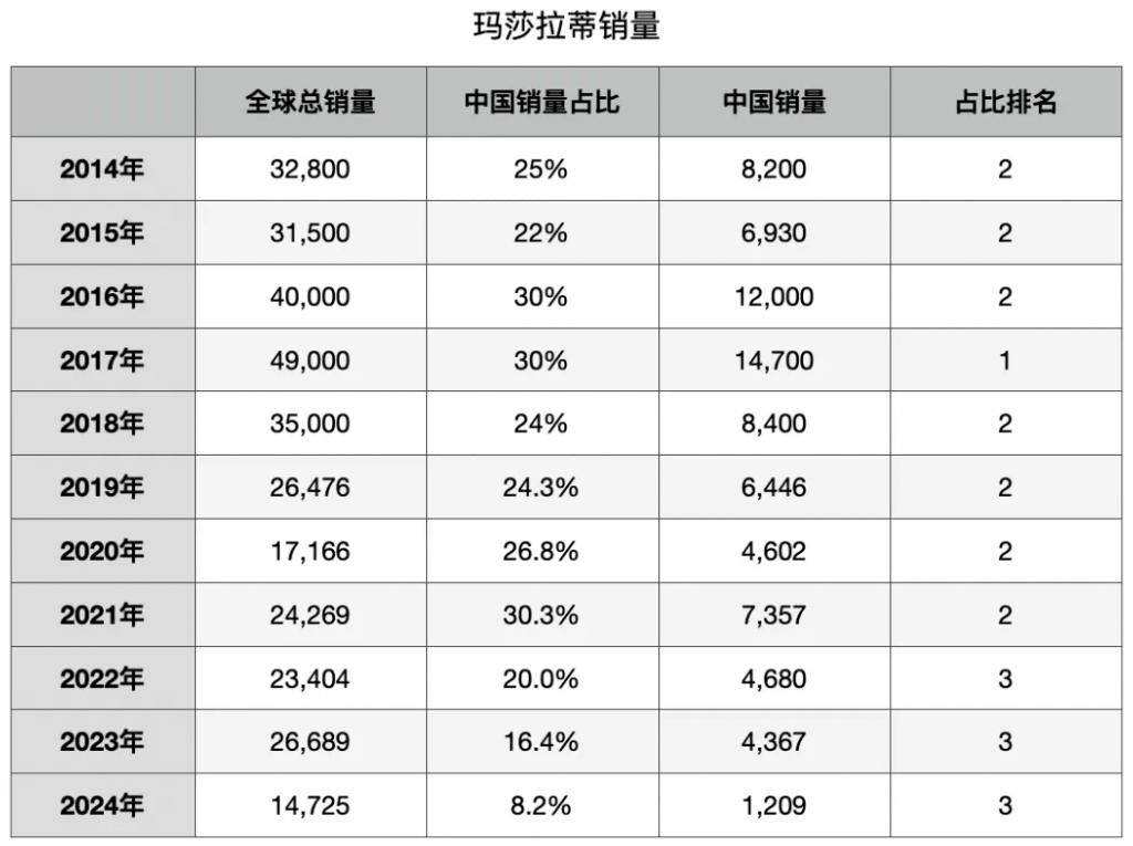 如前文所述,2017 年,玛莎拉蒂在中国市场迎来销量高光时刻后,便开始逐年走下坡路。到了去年,该品牌的销量更是出现崩塌式下滑,多个月份遭遇卖出新车仅两位数的窘境。