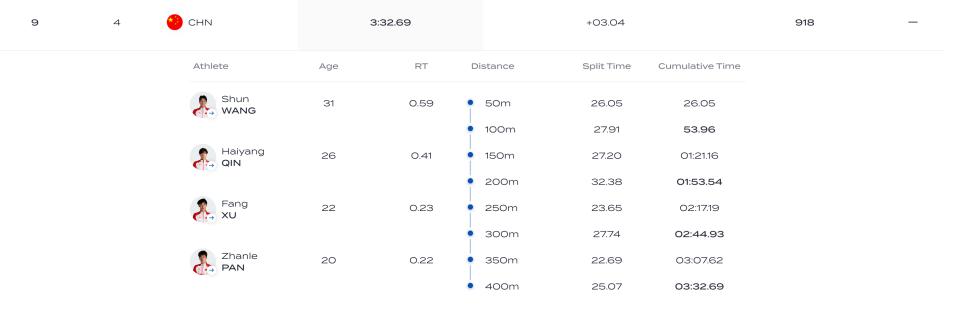 各棒分段成绩,汪顺 100 仰 53 秒 96、覃海洋 100 蛙 59 秒 58、徐放 100 蝶 51 秒 39、潘展乐 100 自 47 秒 76。