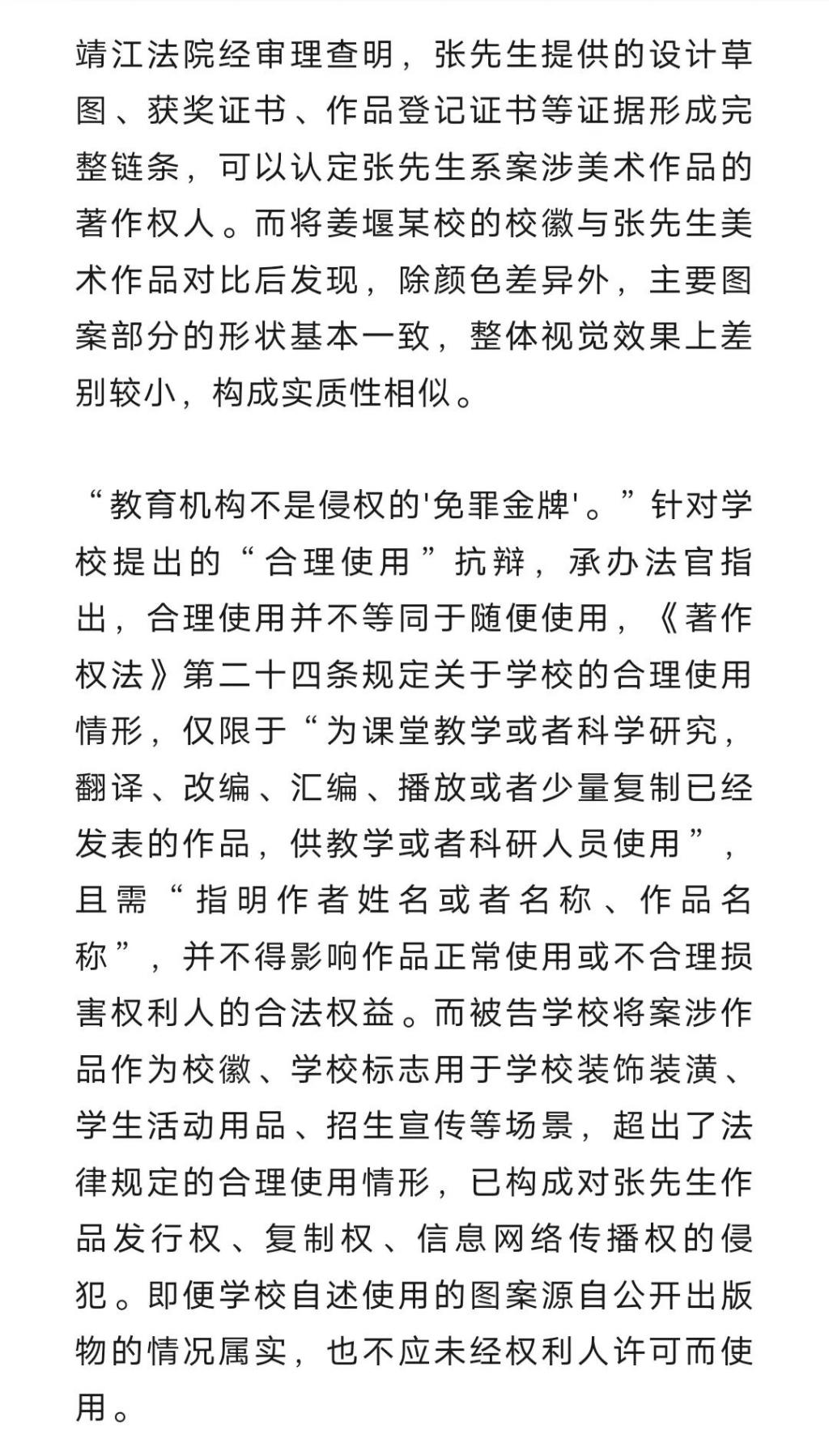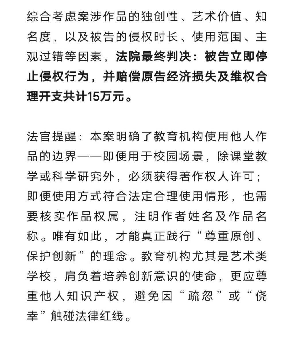近日,江苏省靖江市人民法院公布了一起知识产权案例,北京的张先生 30 多年前曾创作过一幅美术作品,不仅斩获多个奖项,登上中小学美术课本,还被其母校用作校徽。然而其去年无意中发现,自己设计的作品竟被泰州一所民办职业艺术高中用作校徽,于是将该校告上法庭。现代快报记者获悉,靖江人民法院最终判决被告立即停止侵权行为,并赔偿原告经济损失及维权合理开支共计 15 万元。