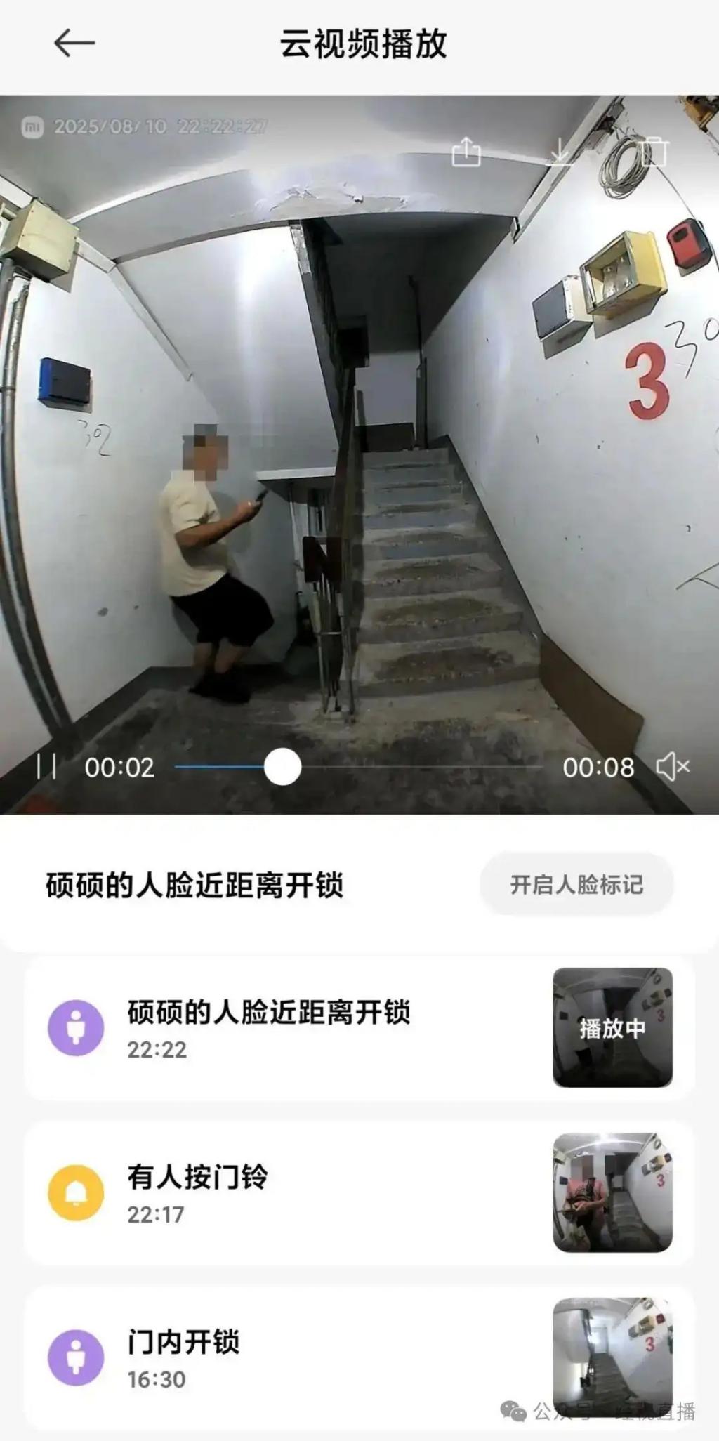 史先生称当晚他点了两单外卖,其提供的门锁日志显示:8 月 10 日 22 时 17 分,有人按门铃;22 时 22 分,硕硕的人脸近距离开锁;22 时 22 分,关门。史先生提供的监控视频显示,门锁被外卖员打开后,外卖员也惊讶地回头查看。