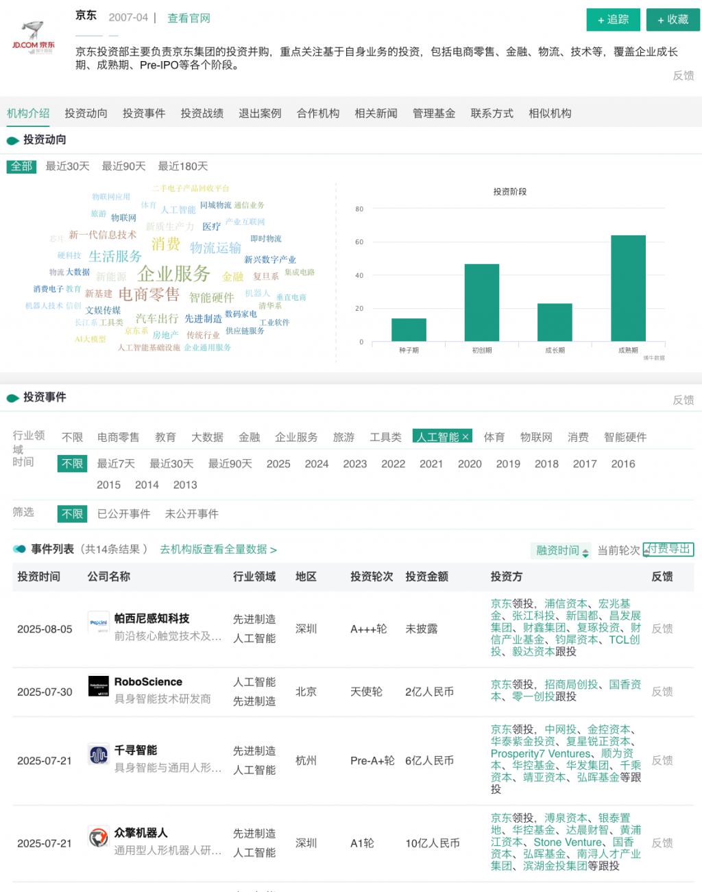 高潮发生在 7 月 21 日,这一天," 京东领投 " 连续出现 3 次,被投具身智能公司分别为千寻智能、逐际动力、众擎机器人。7 月 30 日,京东再度领投具身智能技术研发企业 RoboScience;8 月 5 日,京东最新战略领投触觉感知与具身智能领军企业帕西尼感知科技。