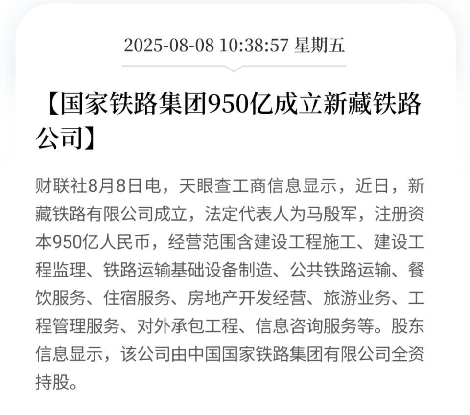 日前,国家铁路集团成立新藏铁路公司,注册资本 950 亿元,推进连接新疆和田与西藏日喀则及拉萨的铁路。