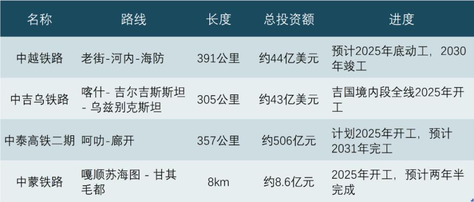 跨境铁路正在加速推进,中越铁路、中泰铁路、中吉乌铁路、中蒙铁路、中巴铁路都已开工,中尼铁路、中缅铁路仍在筹划中。