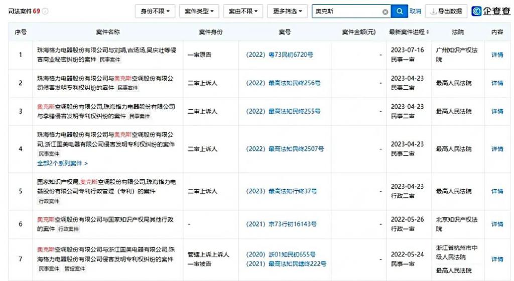 珠海格力电器股份有限公司与奥克斯之间的部分诉讼纠纷 / 图源:企查查