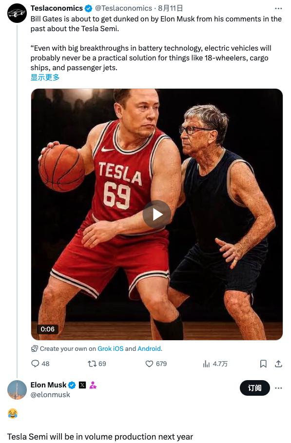 马斯克此次在 X 上的发言,是在回应一位特斯拉支持者时提到的。该支持者提及微软创始人比尔 · 盖茨曾质疑半挂卡车因电池技术限制而不可行。马斯克则以一个笑脸表情符号和 " 特斯拉半挂卡车明年将实现量产 " 的表述作为回应。