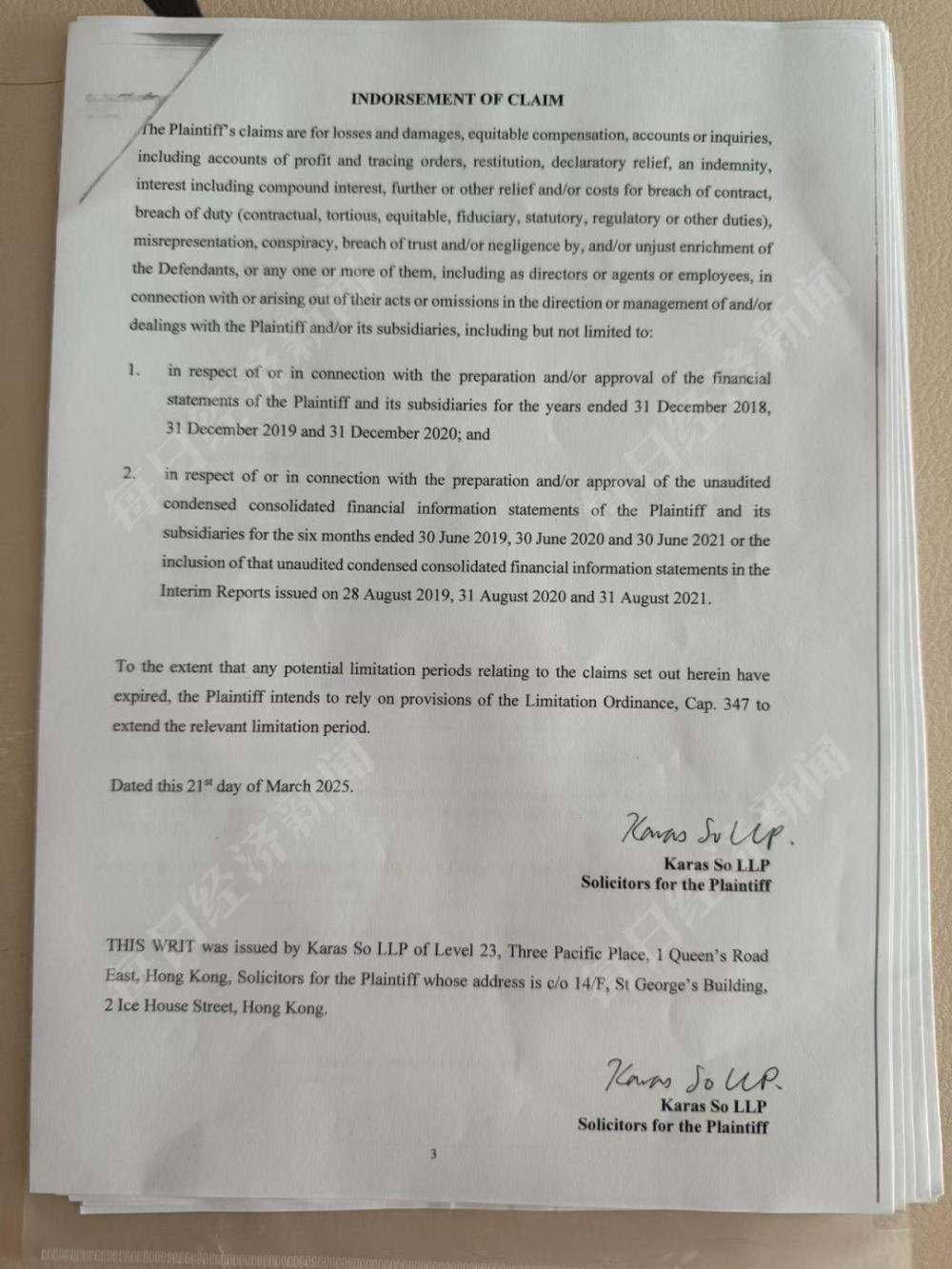 《每日经济新闻》记者从香港高等法院获取的起诉书显示,清盘人认为被告在管理中国恒大期间,因批准了 2018 至 2020 年的年度财务报表,以及批准 2019 至 2021 年未经审计的中期财务报表,涉嫌违反责任,因此提出索赔。
