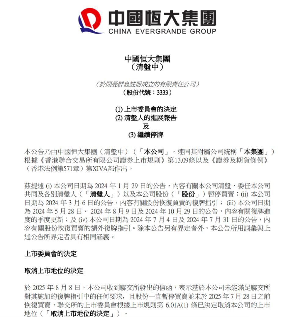2025 年 8 月 12 日,中国恒大宣布摘牌——