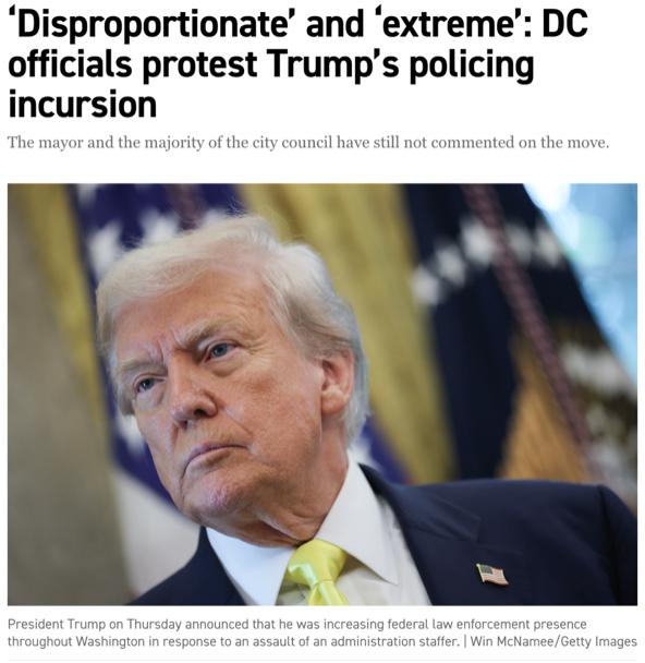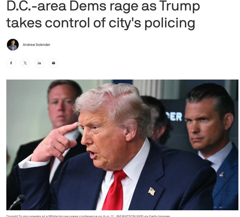 △美国数字新闻媒体 Axios 报道,特朗普对特区警局的接管引发了民主党愤怒。