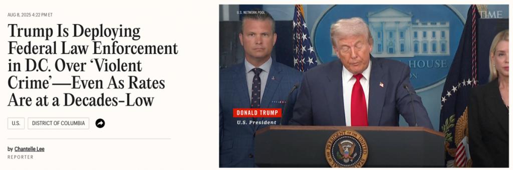 △美国《时代》杂志网站报道,尽管华盛顿特区的犯罪率在下降,但特朗普依然要在特区部署联邦执法力量。
