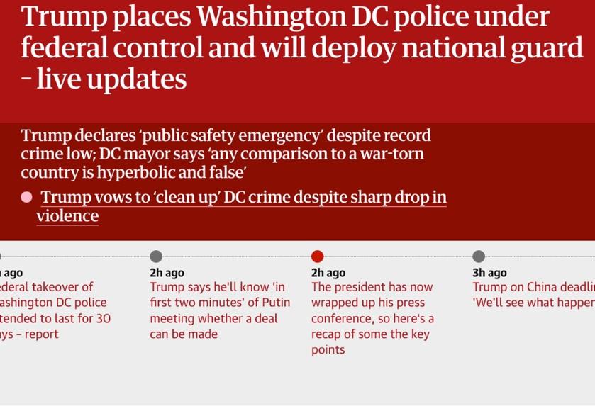 △《卫报》特别开设实时专题报道,关注特朗普政府接管华盛顿特区警局的进展。