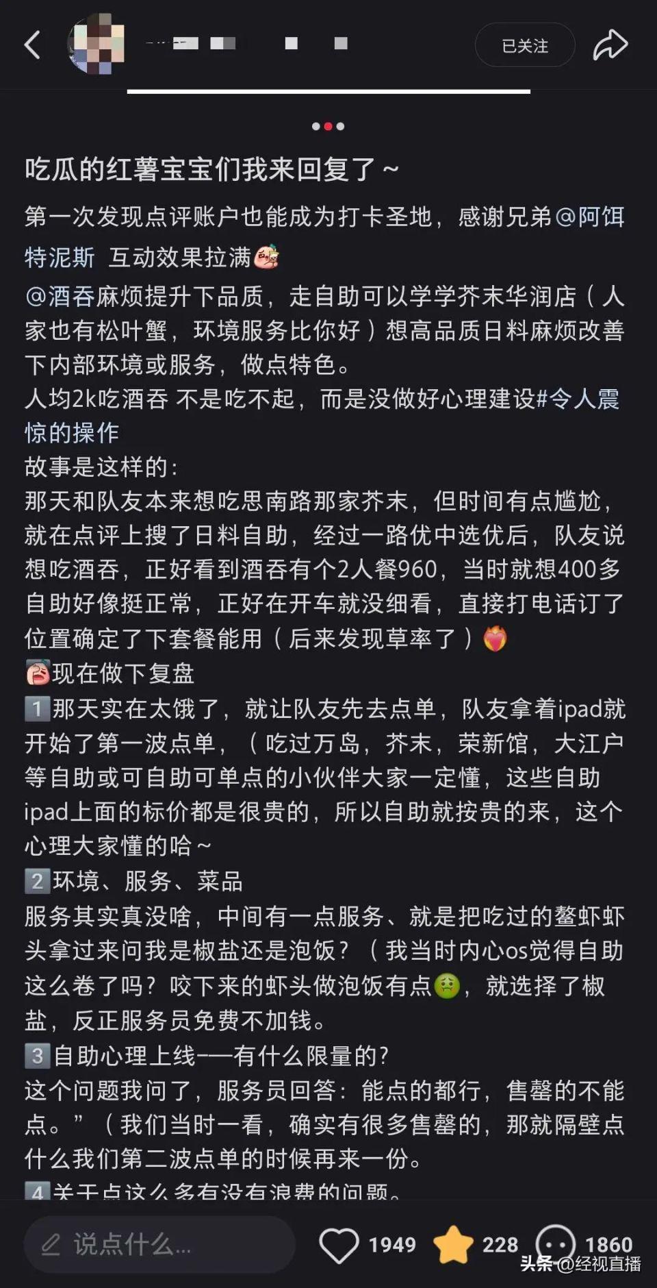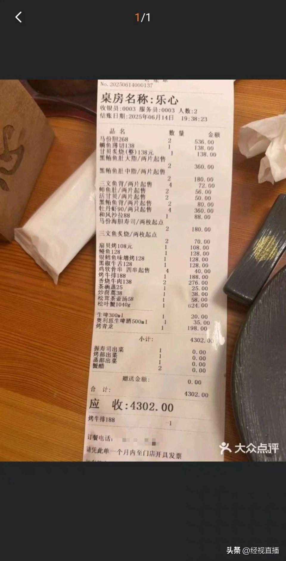 顾客日料店消费4302元引热议:以为是自助餐点了很多!门店:点菜时已告知单价