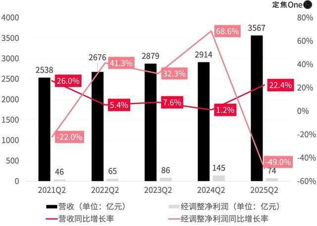 这一亏损的冲击,直观体现在京东本季度的盈利能力上:二季度归属于股东的净利润为 62 亿元,2024 年同期为 126 亿元,同比大跌 51%;经调整后净利润为 74 亿元,2024 年同期为 145 亿元,同样也接近腰斩。