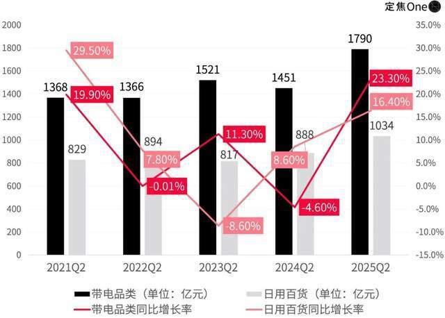 先来看前者,二季度商品收入为 2824 亿元,同比增长 20.7%;其中 " 带电品类 " 收入 1790 亿元,同比增长 23.3%,日用百货营收 1034 亿元,同比增长 16.4%。值得注意的是,两大品类的同比增速均达到 2022 年以来最高点。