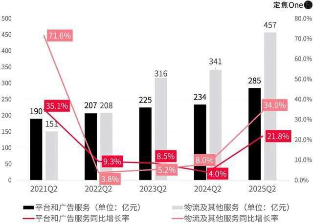 再看服务收入,本季度实现营收 742 亿元,同比增长 29%;其中平台和广告业务收入 285 亿元,同比增长 21.8%;物流及其他收入 457 亿元,同比增长 34%。