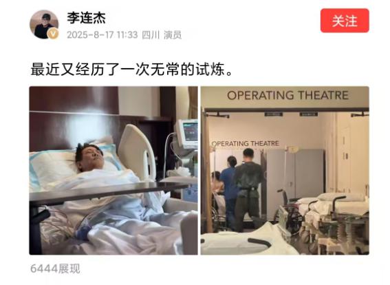 8 月 17 日,李连杰更新社媒配文:最近又经历了一次无常的试炼。查看图片发现,李连杰本人躺在病床上,还配有一张外拍手术室的照片。网友纷纷询问:怎么了,祝早日康复。