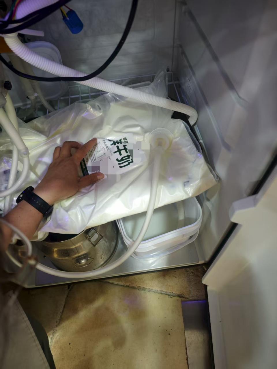 现打鲜奶究竟是怎样一种产品?与超市销售的包装巴氏奶有何区别?新京报记者近日对北京地区的红星前进面包牛奶公司(崇文门店)、三元北京市牛奶公司(鼓楼店)、味多美(磁器口店)、百年义利(幸福大街店)、七天牧场鲜奶吧(农光里店)等 5 家门店进行探访,了解到现打鲜奶并非从牧场直接拉到门店进行售卖的生乳,而是经过巴氏杀菌处理后的大包装规格鲜牛奶(巴氏奶),由供应商每日配送。这种大包鲜奶规格通常在 10 公斤左右,使用时会被放置在打奶机下方冷柜中,通过软管将奶液与冷柜上端的出奶口连接。